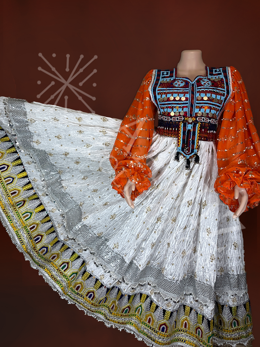 Pari Gul – White & Orange Traditional Afghan Dress (Three Piece)